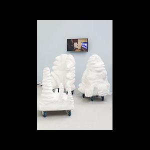 A mother and child sculpture on wheels and a video of the artist living with the family of objects she created as an experiment which developed into one of mutual awareness and friendship. Items collected include a mother and child polystyrene form and a video charting life for the artist in the company of her polystyroom companions.