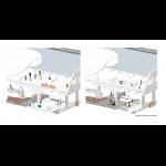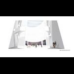 Similtaneously a void in the centre cuts through all existing structure; a gallery. The most permenat change applied to the building, signifying the timeless nature of art. A ring around it, acting as an access coridor, separates the ritual contemplating of art from the mundane. The wall of the inner ring are translucent to allow light into the sections and project it out like a plantern; a light calling us to explore the gallery and the light of art illuminating the greyness of the everyday.