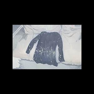 A still life painting depicting a birds eye view of a black dress on a sofa. Subdued and supressed tones.