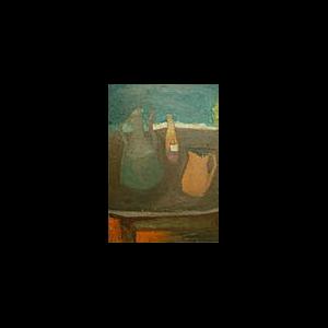 Still life featuring a coffee pot, bottle and jug with thickly applied paint.
